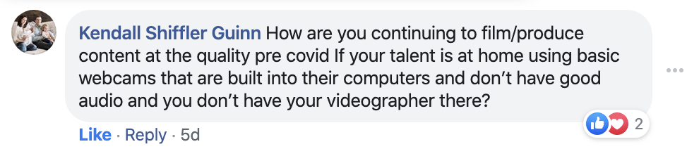 "How are you continuing to film/produce content at the quality pre covid If your talent is at home using basic webcams that are built into their computers and don’t have good audio and you don’t have your videographer there?"